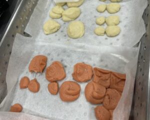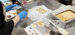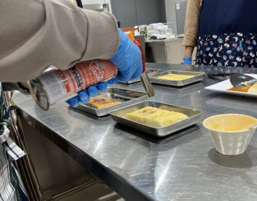 ソフミートさけ、ソフミート白身魚(たら)を流水で解凍し、沸騰しただし汁に入れる方法と、キッチンペーパーの上へ好きな大きさへ絞り出し、スチームコンベクションオーブンで蒸す方法の2種類をお教えいただきました。今回は絞り出してオーブンで蒸す方法で。