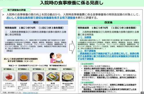 *入院時の食事療養の質の向上を図る観点から(略)おいしく安全な食形態で適切な栄養量を有する嚥下調整職を新たに評価する。