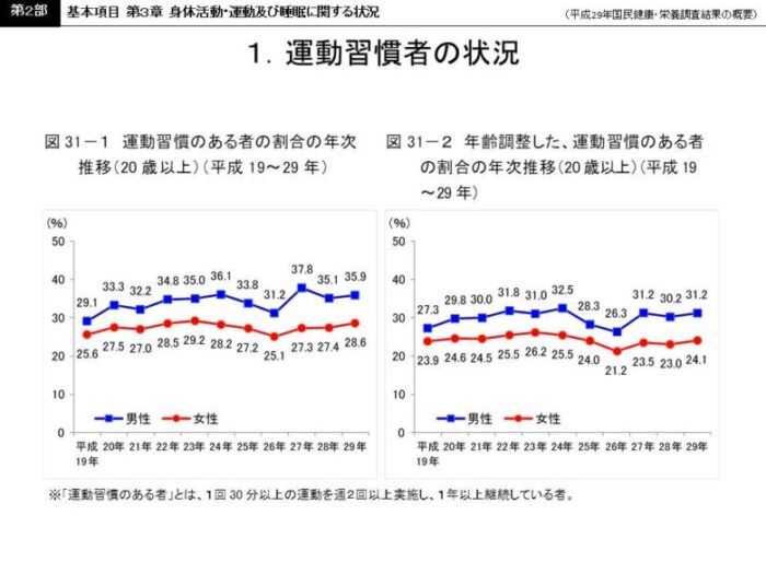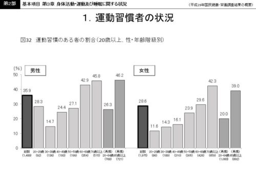 『健康日本21』での目標にも掲げられているこの項目ですが、平成29年国民健康栄養調査によれば、習慣的な運動が出来ている割合は