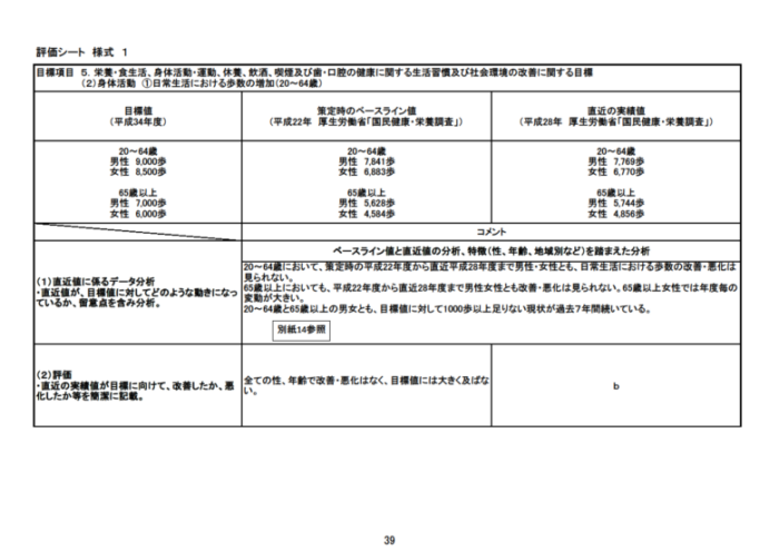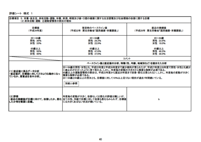 この目標値の設定に関しては、ベースラインや実績値に比べて、運動習慣の割合はおよそ10%、歩数はおよそ1,500歩 増やす値を目標としています。