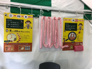 ヒトの消化の仕組みや消化管を可愛いパネルで紹介し、小腸の長さや内部のひだ、大腸の様子を