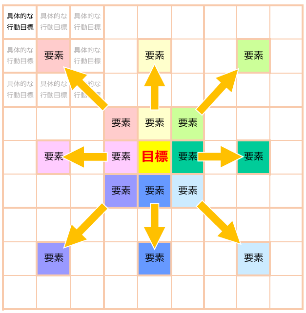 この小目標一つ一つをこなしていけば中目標に必要な要素を満たすことができ、中目標が全て達成できれば、大きな目標(中央のマス)が達成できることになるのです。抽象的な目標を細分化していくことで自分が何をするべきなのか、何から始めるのかという手近なことへと落とし込んでいく、という手法です。