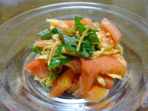 トマトはざく切りにして、青しそは細切りにして、混ぜる。