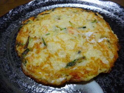 フライパンにサラダ油をひき熱して、生地を直径5cmの大きさに薄く広げて中火で1分焼き、裏返して2分焼き、完成。