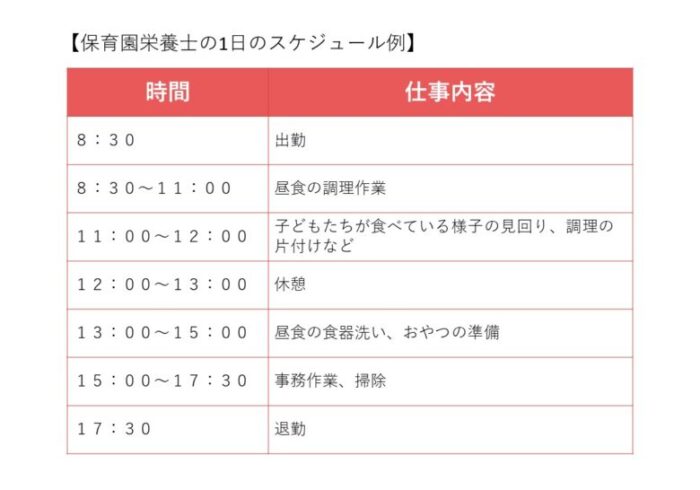 保育園栄養士の勤務時間は、「8時~17時」前後が基本です。早番・遅番がある場合は、1時間程度ずつ前後します。